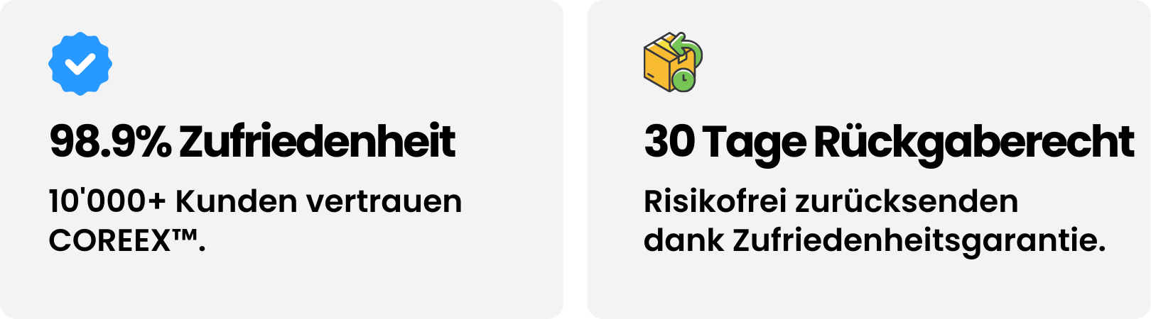 Wir sind überzeugt von der Qualität und Leistung unserer Produkte und möchten, dass du ebenfalls überzeugt bist. Daher bieten wir dir eine risikofreie Möglichkeit, unser Produkt auszuprobieren. Wenn du aus irgendeinem Grund nicht zu 100% zufrieden bist, hast du volle 30 Tage Zeit, um es zurückzugeben und eine vollständige Rückerstattung zu erhalten.